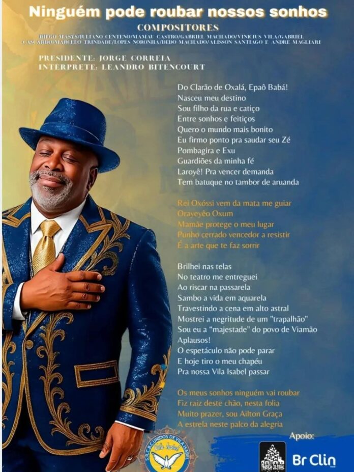 O desfile será realizado no Complexo Cultural do Porto Seco e terá como tema “Ninguém Pode Roubar Nossos Sonhos”, exaltando a vida e obra de Aílton Graça.